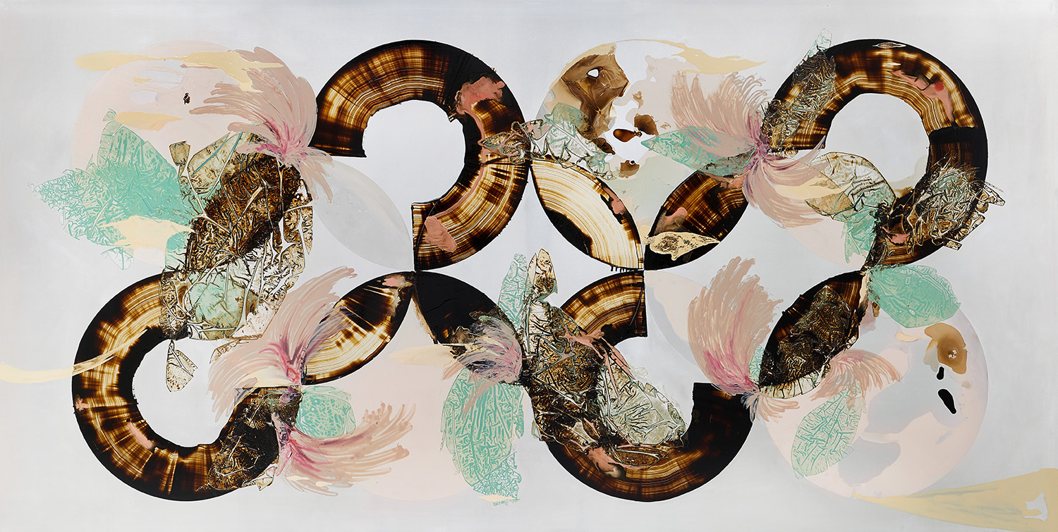 The blossoming of life against the cyclical nature of time is evoked in the articulation of organic gestures and repetitive drags of bitumen strokes. Eden, the garden of earthly paradise believed to be inhabited by the first man and woman, is referenced as a starting point to question the (pre)transient grounds of the human condition. The artist probes into the porosity and creation of memory and life by staging fluid dialogues. She uses contrasting mediums while embracing spontaneity— negotiating the force of gravity with a language of abstraction.