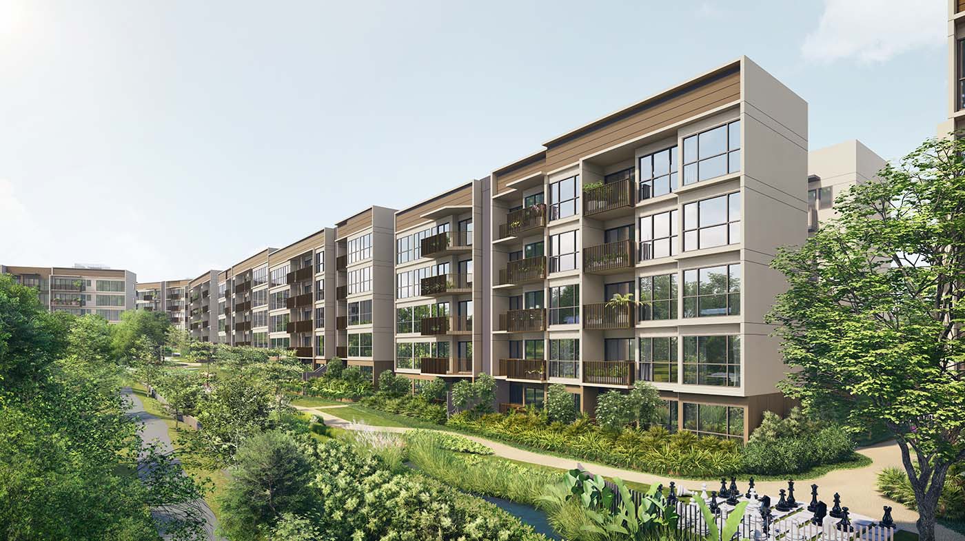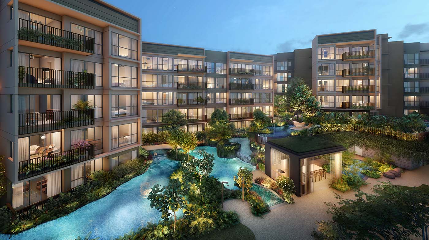 The development itself is inspired by a trove of nearby waterbodies and parks such as Sungei Khatib Bongsu, Lower and Upper Seletar Reservoirs and the Sembawang Hot Spring Park. Harnessing the undulating topography of the site, the development features a generous water body surrounded by verdant plants. More than 60 facilities are presented within three thematic zones: The Waters, The Gardens, and The Social.