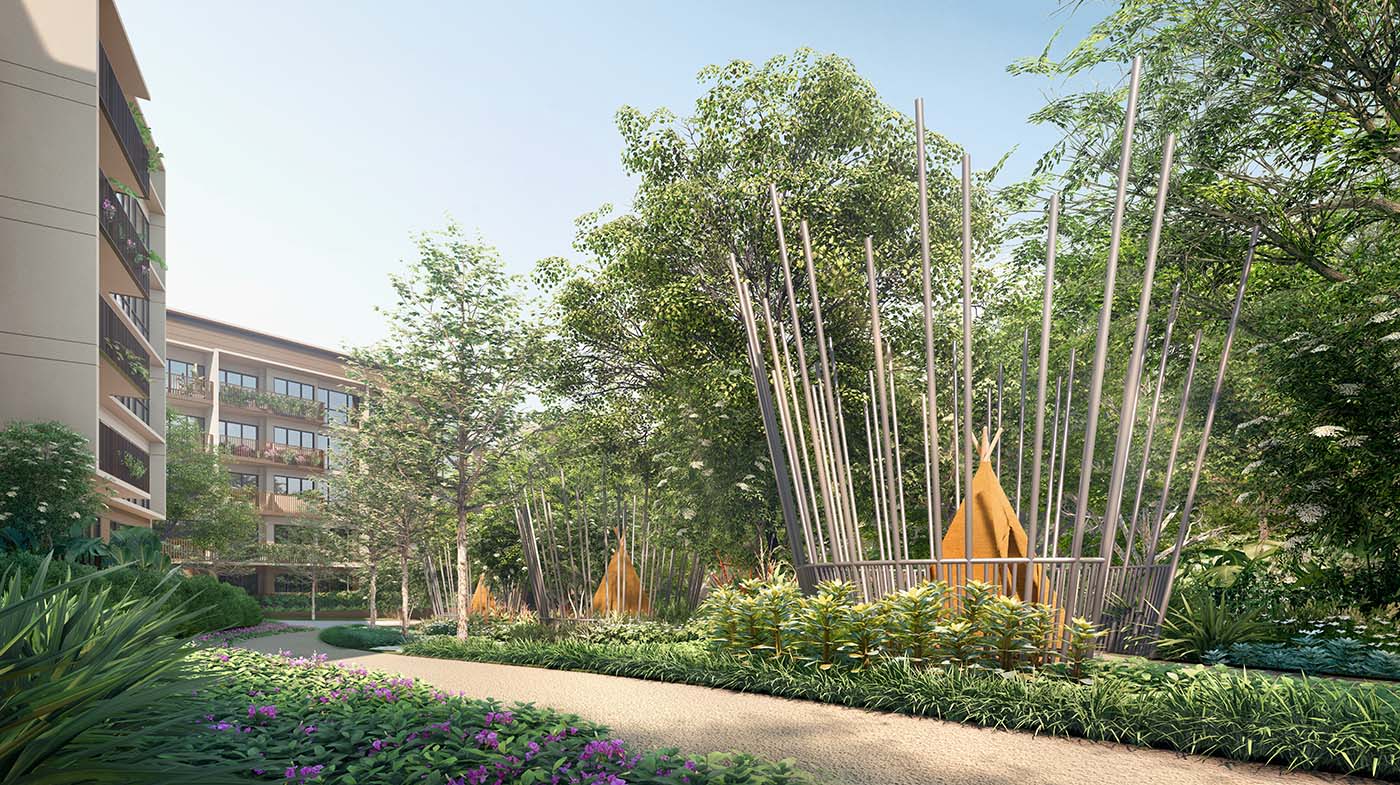 The Waters zone includes a 50m lap pool, Jacuzzi island, a children’s water play slide, a water jet terrace and hammocks suspended right above the pool, among other features. As its name suggests, The Gardens zone immerses residents in greenery through features such as a recreation lawn, a fireflies garden, teepee decks and a swing garden.